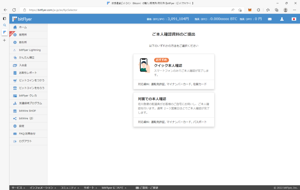 お次は、身分証明書と顔の撮影です。上のクイック本人確認はスマホでできるのでお勧めです。